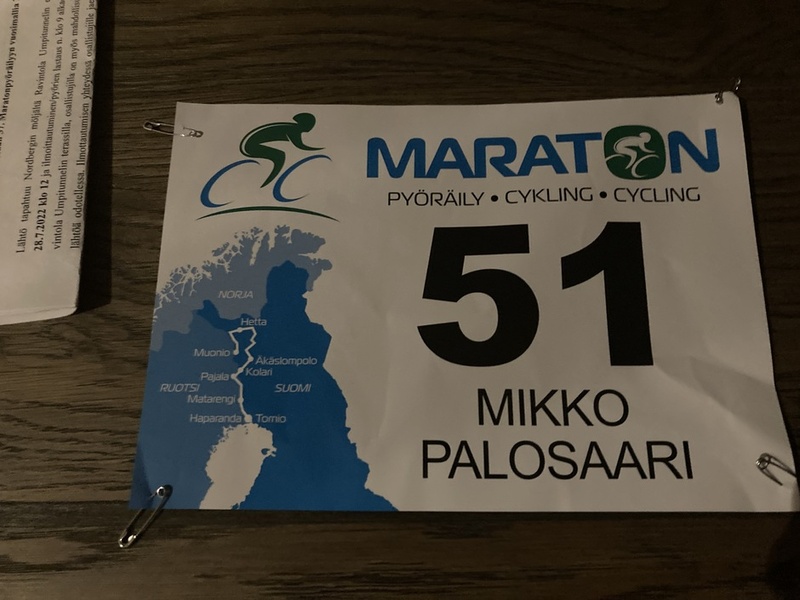 Kesän 2022 järjestyksessään 37 Maratonpyöräily ajettiin 28-30.7.2022. Reittiä uudistettiin edelliseltä kesältä molemmille päiville. Suurimpana muutoksena lähtö tapahtui Muonion Harrinivasta Kilpisjärven sijaan. Myös toisen päivän reittiä muutettiin, eli menimme Ruotsin valtakunnan puolelle jo Kolarista. Pyöräilijöitä oli hieman tavallista vähemmän eli jäätiin alle sataan osallistujaan. Tapahtuma aloitettiin Torniossa torstai aamuna ilmottautumisella Ravintola Umpitunnelin piha-alueella. Osallistujille jaettiin numerolaput sekä vuoden 2022 T-paidat. Pyörät lastattiin kuorma-autoon ja matkaan päästiin Jussilan linja-autoilla klo 12. Matkan aikana kerrattiin tapahtuman kulkua, uudistettua pyöräreittiä huoltopisteineen. Lisäksi Olavi tapansa mukaan viihdytti toisessa linja-autossa osallistujia. Lyhyt kahvitauko pidettiin Pellossa. Perille Harrinivaan saavuttiin n. klo 15:30 missä osallistujat majoittuivat huoneistoihin, jotka oli jaettu etukäteen toiveiden, pariskuntien ja sukupuolien mukaan. Harrinivassa kasattiin pyörät, käytiin omatoimisesti lyhyet testilenkit sekä tehtiin viimeiset huollot. Ennen päivällistä ehdittiin myös saunomaan. Perjantaiaamuna pyöräilijät lähtivät ryhmittäin liikkeelle klo 06:00 - 07:30 sekä 09:15. Ensimmäinen huoltopiste sijaitsi Sonkamuotkassa Sannan puodin piha-alueella n. 39 km matkan jälkeen. Toinen huolto oli ennen Hettaa Muotkajärven rannalla, Hetan jälkeen liikenne hiljeni entisestään ja matkaa taitettiin Ounas- ja Pallastunturia kiertäen. Maisemat pääsivät viimeistään oikeuksiinsa Ounasjoen ylityksen jälkeen. Pallasjärven nousun muistanevat kaikki osallistujat kauneudestaan sekä myös raskaudestaan. Viimeinen huoltopiste oli Muotkavaarassa josta alkoi kesän 2022 lyhennetty n. 33km vapaataival Äkäslompoloon ja "Pirtukirkkoon" eli Äkäshotelliin. Allaolevassa taulukossa on ryhmien ajoaikoja. Ajat sisältävät vapaataipaleen joten yksittäisten pyöräiljöiden ajat ja keskinopeudet voivat hieman poiketa toisistaan.