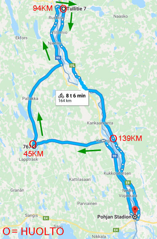 Rajaväylän lenkki ajettiin siis lauantaina 30.6.2018 klo 10 alkaen vajaan 50 pyöräilijän voimin. Ruotsin puolen tietöistä johtuen kierrettiin Lapinjärven kautta Ruotsin puolen Hietaniemeen, mistä matka jatkui perinteistä reittiä myöden Aavasaksalle. Kokonaismatkaksi tuli ~163,5km. Menomatkalla pyöräiltiin melko kovaan vastatuuleen ja ryhmät pysyivät hyvin kasassa. Paluumatkan myötuulessa sitten vauhti kasvoi merkittävästi ja tapahtui jonkin verran ryhmien sirpaloitumista. Huoltopisteitä reitillä oli kolme Lapinjärvessä, Aavasaksalla ja Karungissa. Lisäksi Pohjanstadionilla pyöräijöille tarjoiltiin maittava lihakeitto. Järjestäjät kiittävät kaikkia osallistujia!
